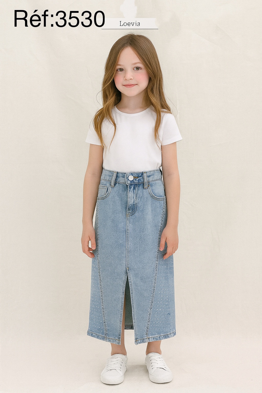 Cette superbe jupe en jean longueur midi est décorée de jolis cœurs en strass sur le devant, pour un look girly, chic et tendance. Sa coupe droite et sa fente à l’avant apportent une touche moderne tout en restant confortable et facile à porter au quotidien.